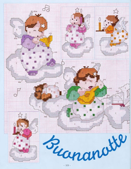 Φιγούρες με χαρούμενα αγγελάκια για κέντημα πάνω σε παιδικά σεντόνια και μαξιλαροθήκες.